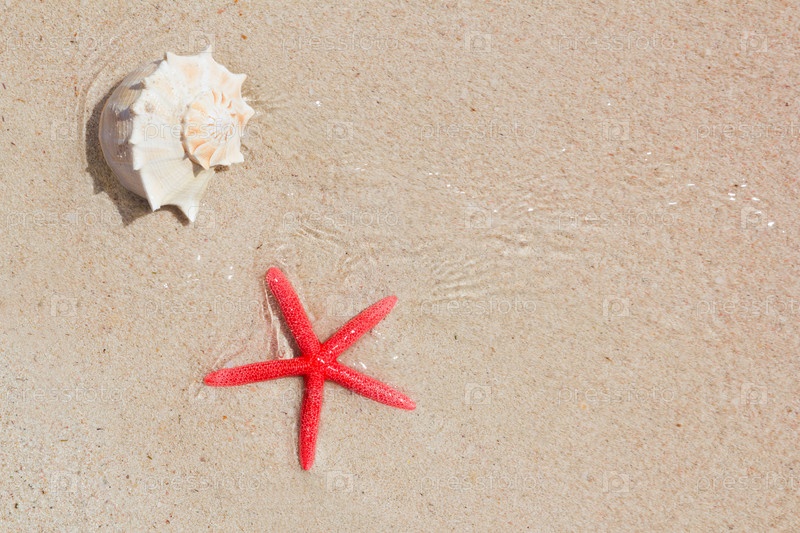 Раковины и звезды в белый песчаный пляж как летние каникулы символы