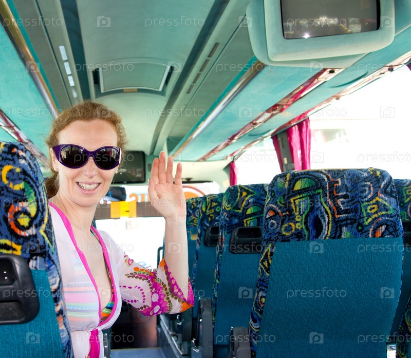 Девушка на туристический автобус счастливым с солнцезащитные очки с приветствие жест