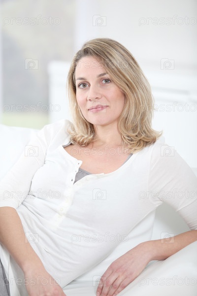 Портрет красивая блондинка женщина, сидя на диване