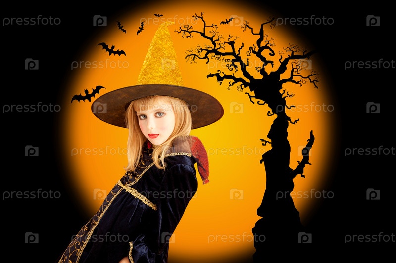 Красивая девушка Хеллоуин в сухих деревьев и Бат оранжевый фон