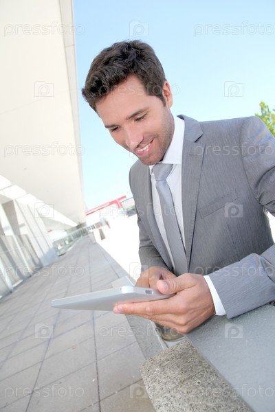 Бизнесмен, используя электронный планшет за пределами здания