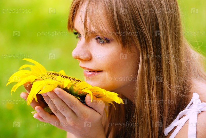 Красивая молодая женщина пахнет портрет подсолнуха крупным планом
