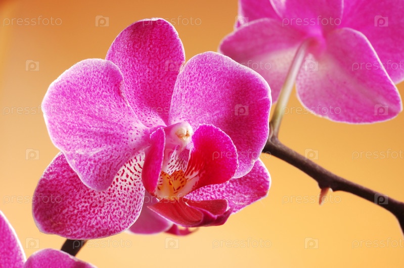 Крупным планом розовые цветки орхидеи на оранжевом фоне