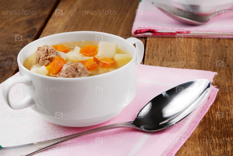Домашний суп с фрикадельками на деревянный стол