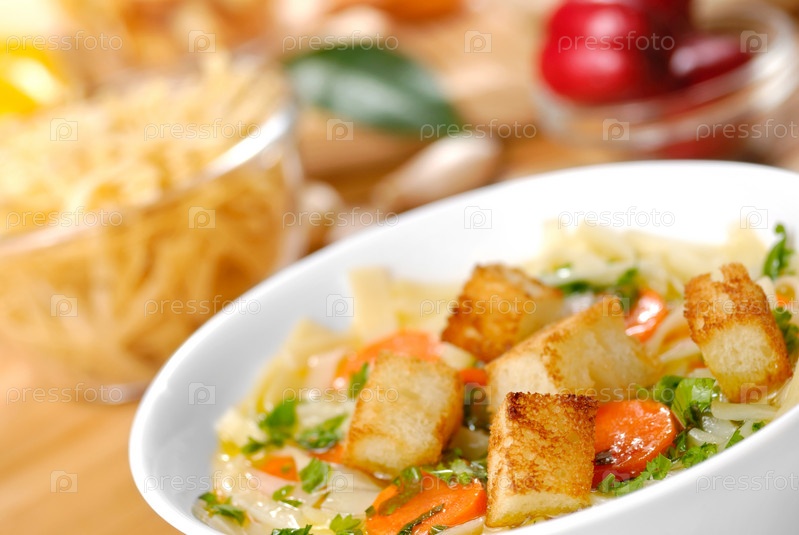 Нудл суп с морковью, гренки и овощами