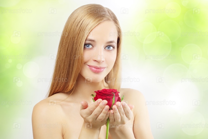 Красивая естественная девушка с красной розой в ладонях