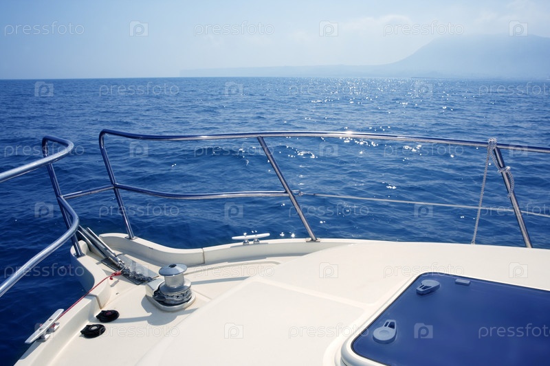 Лодка лук, парусный спорт на синее море с якорь цепь и лебедка деталей