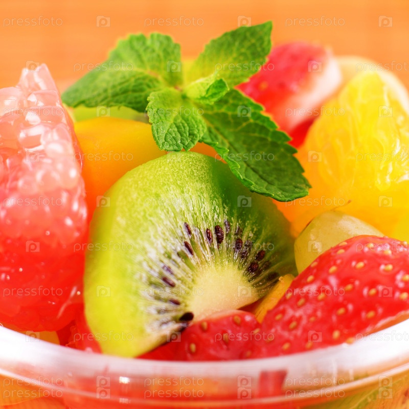 Здоровый фруктовый салат в стеклянной кастрюли