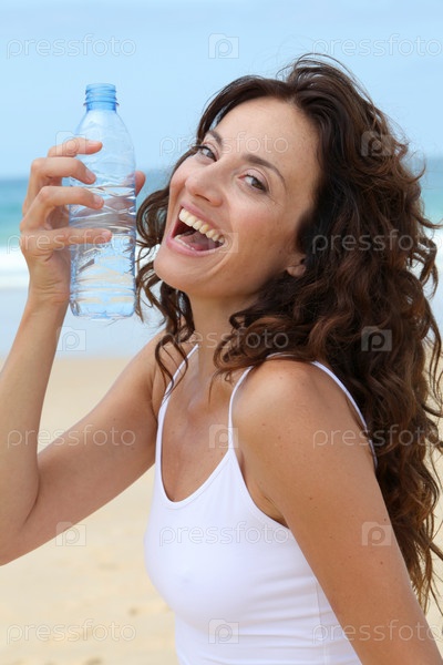 Красивая женщина питьевой воды на пляже