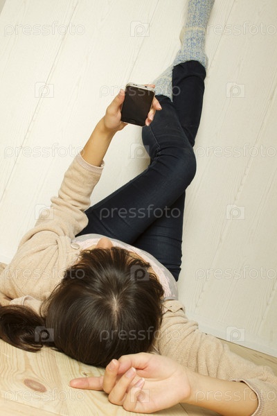 Женщина лежит на полу с поднятыми вверх ногами и мобильным телефоном в руках