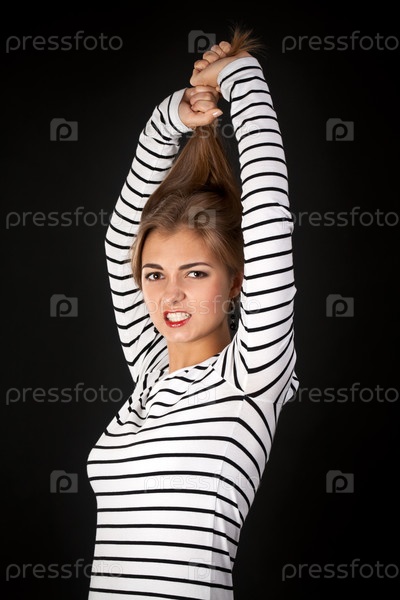 Портрет девушки в полосатом платье на черном фоне