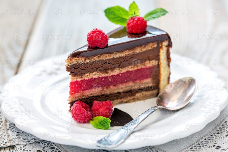 Кусок шоколадного торта с малинового желе