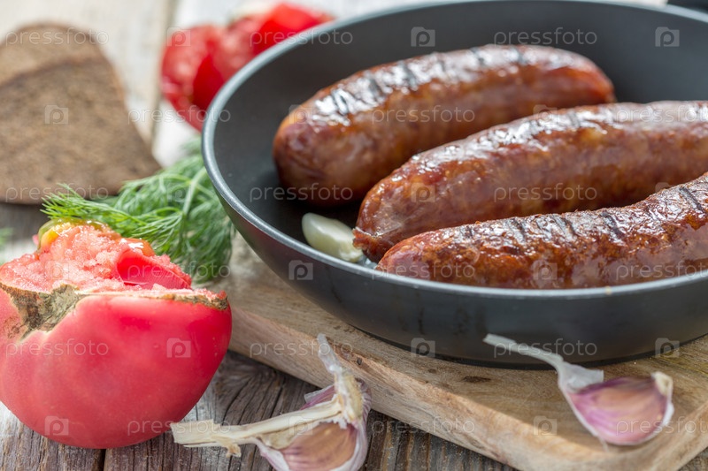 Жареный Колбаса, помидоры и чеснок крупным планом