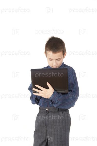Мальчик с ноутбуком на белом фоне