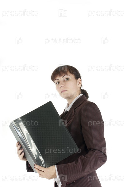Бизнес-леди с папкой для бумаг, на белом фоне
