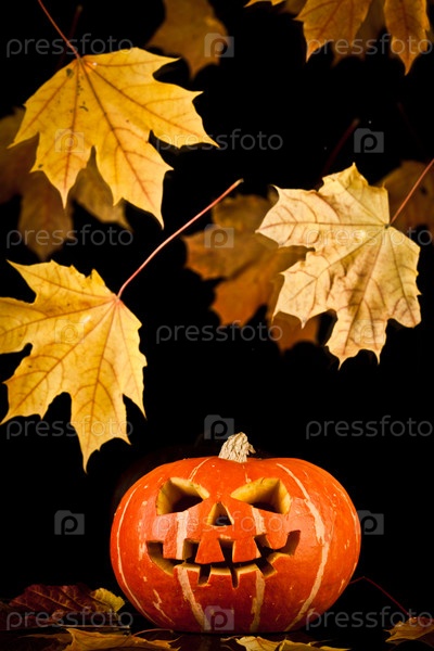 Страшная тыква для Хэллоуина и осенние листья на черном фоне