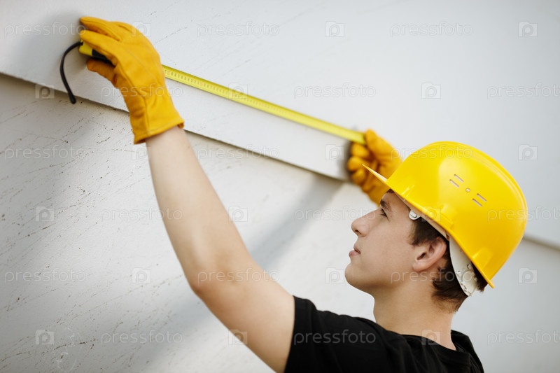 Молодой строитель с желтой ленты мера, выборочный фокус, мягкий естественный свет