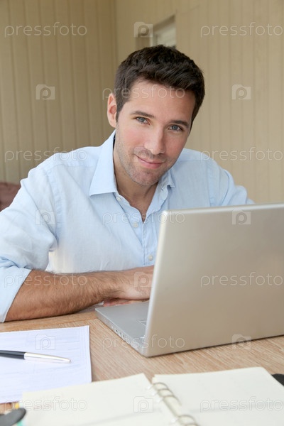 Улыбающийся человек, работающих на дому, на портативном компьютере