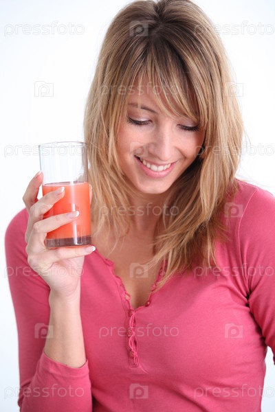 Красивая женщина пьет сок томатный
