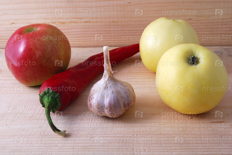 Острый перец, яблоки и чеснок на деревянном столе