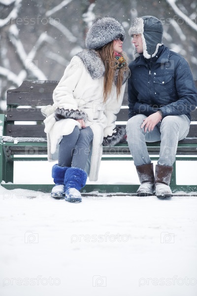 Молодая пара в любви, сидя на скамейке в парке