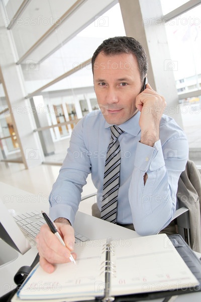 Бизнесмен на телефоне писать на повестке дня