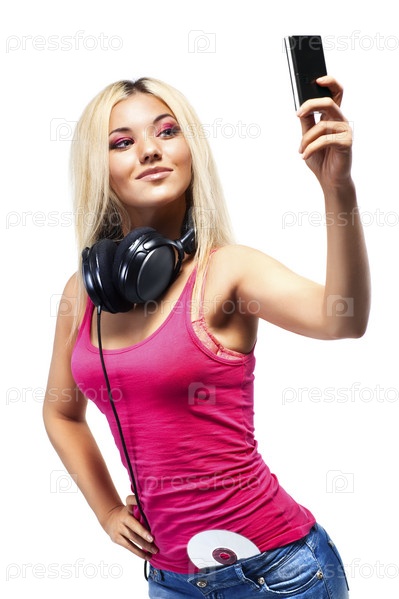 Молодая женщина с наушниками и мобильный телефон. Изолированные на белом фоне
