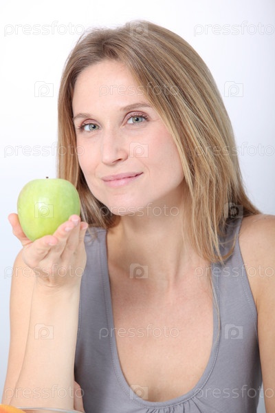 Красивая блондинка женщина ест зеленое яблоко