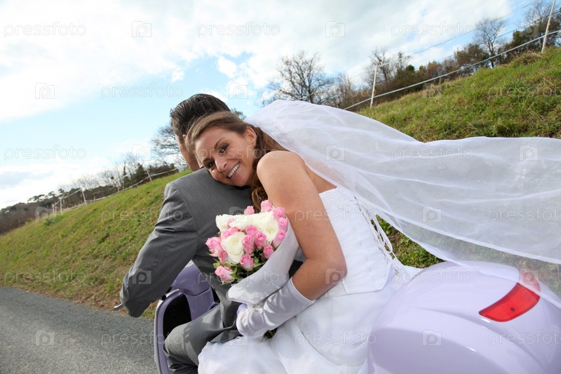Супружеская пара, езда мотоцикл на их день свадьбы