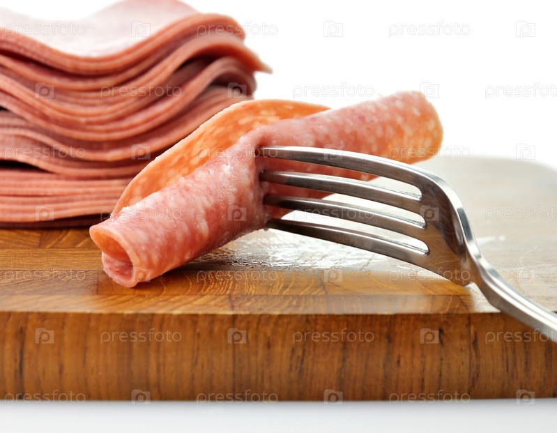 Стек ломтиками салями и вилкой