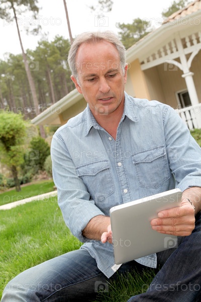Человек, сидящий в домашнем саду с сенсорной панелью