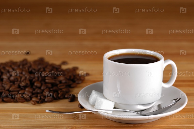 Чашка черного кофе и жареных кофейных зерен на деревянный стол