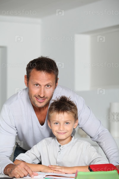 Отец сына помогая делать домашнее задание