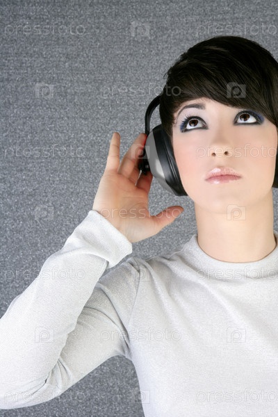 Футуристический моды будущего женщина, слушание музыки Серебряный Наушники