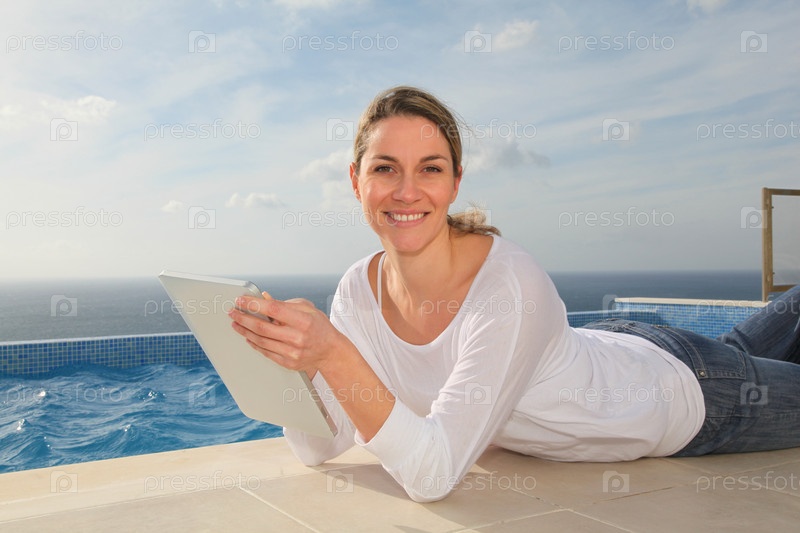Женщина с помощью электронных таблетка, плавательный бассейн