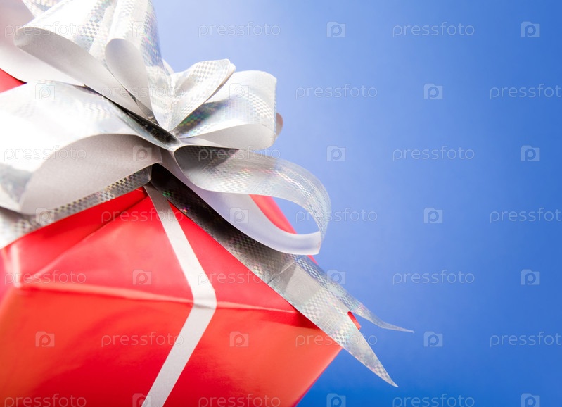 Макро изображение серебряного узла на красном коробке для подарков, выделенном на синем фоне