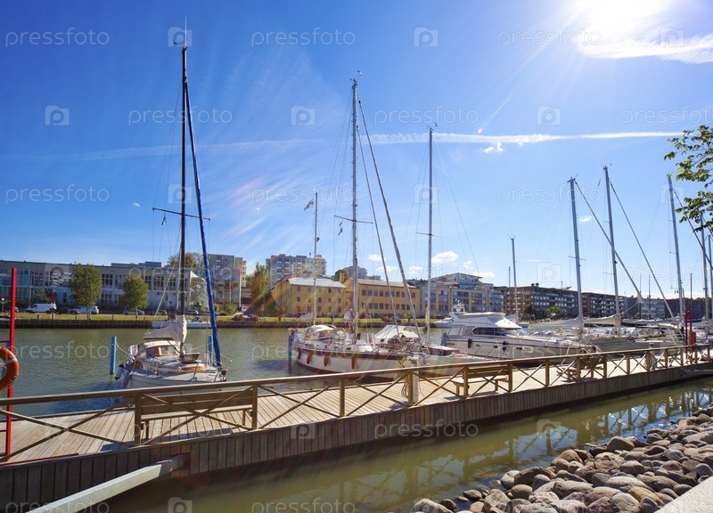 Турку Финляндия городского пейзажа. Вид на гавань с яхтами