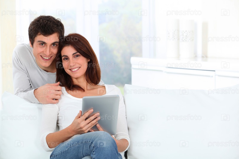Молодая пара с помощью электронных вкладки на диване