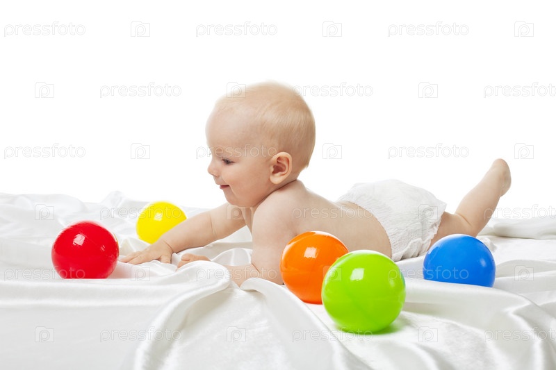 Портрет маленького ребенка с разноцветными шарами на белом фоне