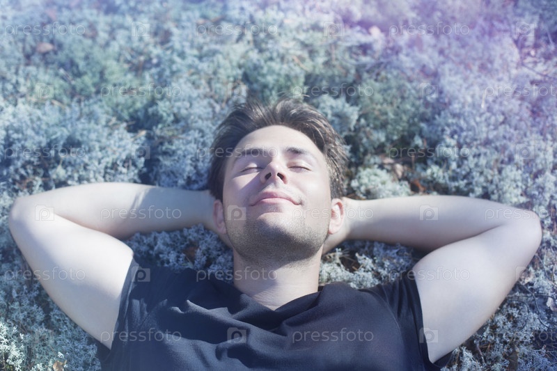 Молодой человек отдыхает на траве в лесу