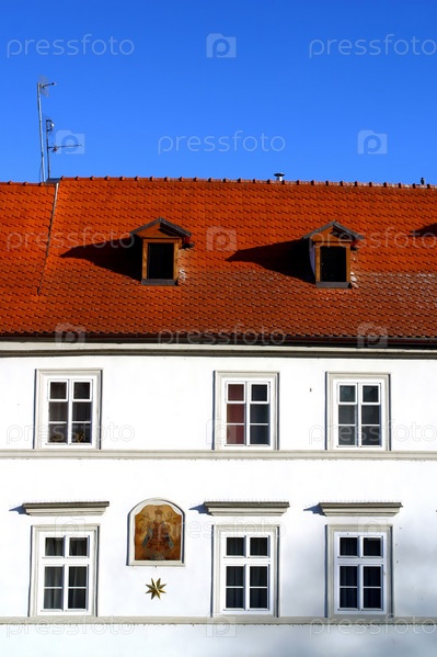 Старый дом с красной на крыше в Праге