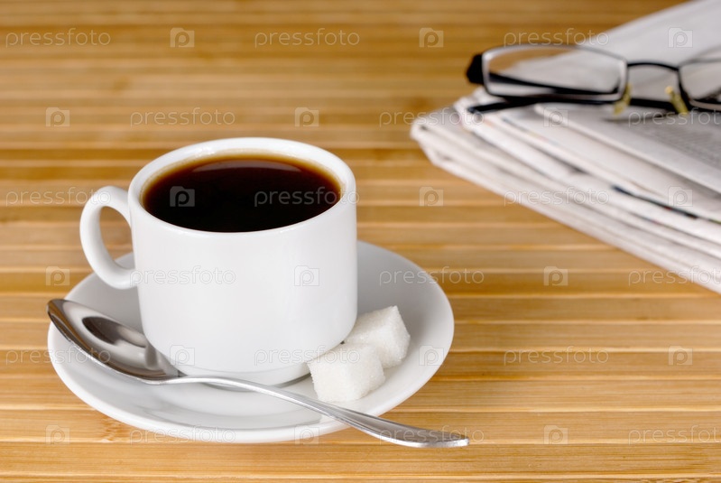 Чашка черного кофе на деревянный стол с очками и газета сторону