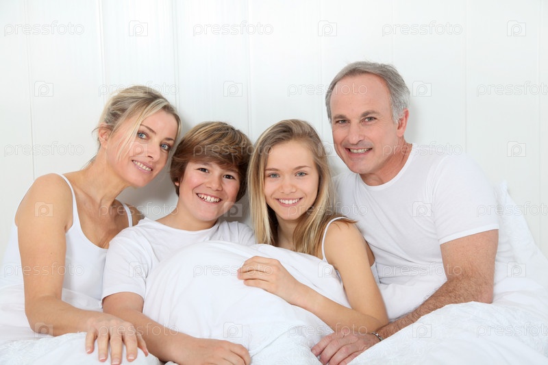 Портрет счастливой семьи в постели утром