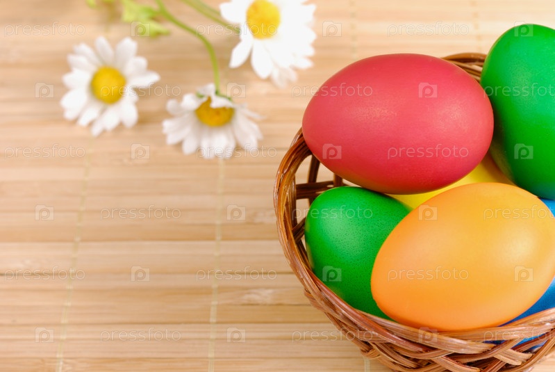Плетеная корзина с пасхальные яйца и ромашки над деревянными фоне