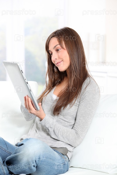 Молодая женщина, сидя на диване с электронной площадки