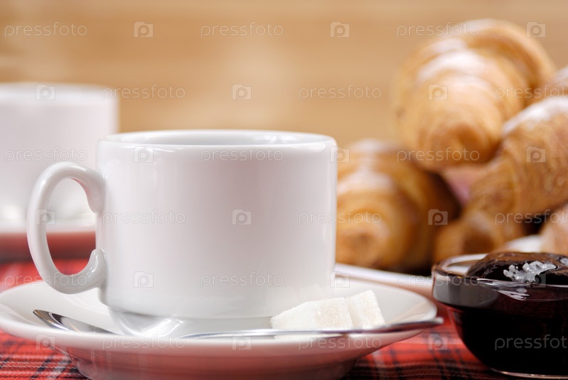Чашка кофе и круассанами на клетчатой скатертью