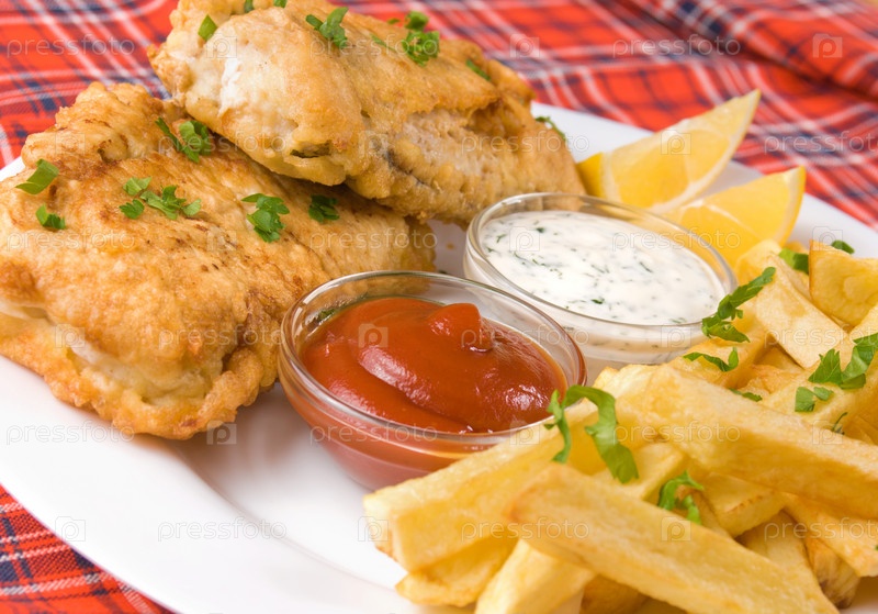 Рыба и чипсы, майонез и кетчуп на красной скатерти