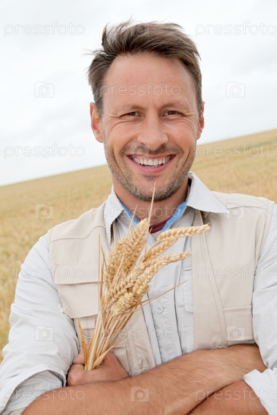 Портрет красавец, стоя в поле пшеницы