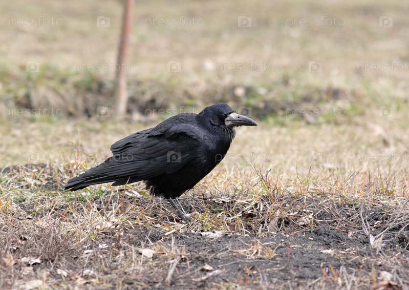 Черная ворона стоит на траве