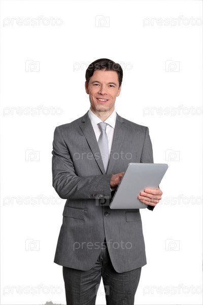 Бизнесмен, стоя на белом фоне с сенсорной панелью